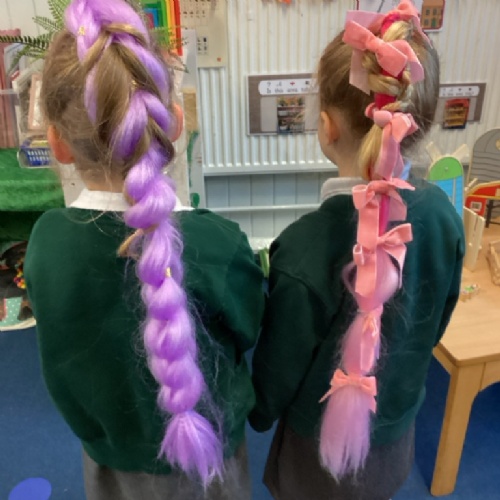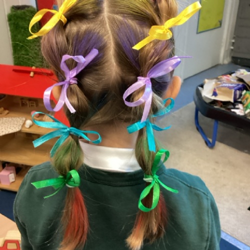 Reception are continuing to enjoy their learning about dinosaurs. We have painted pictures of dinosaurs using watercolour paints, created dinosaur bones with salt dough and written dinosaur facts. We also had great fun last week decorating our hair for Crazy Hair Day!