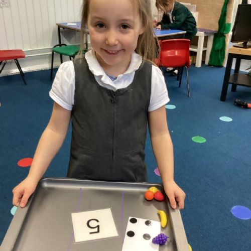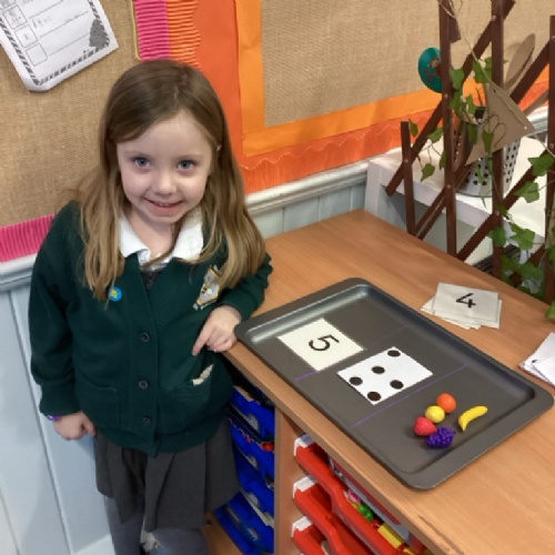 Maths We have been practising counting accurately and remembering to stop at the 'stopping' number. We have also looked at different ways of representing a number, for example with numerals, dot patterns and sets of objects. Next week we will build on this by looking at and describing different arrangements of up to 5 dots.