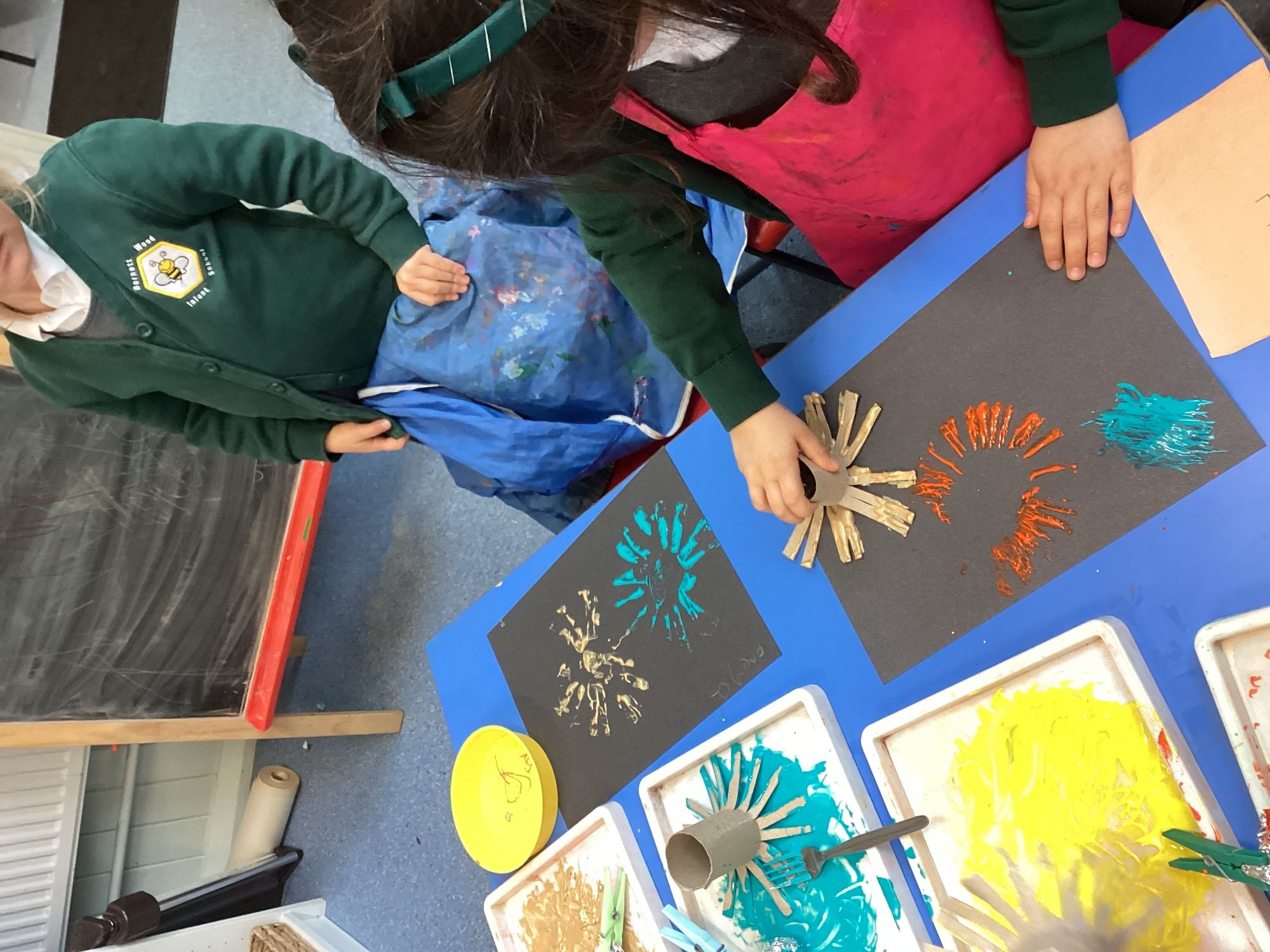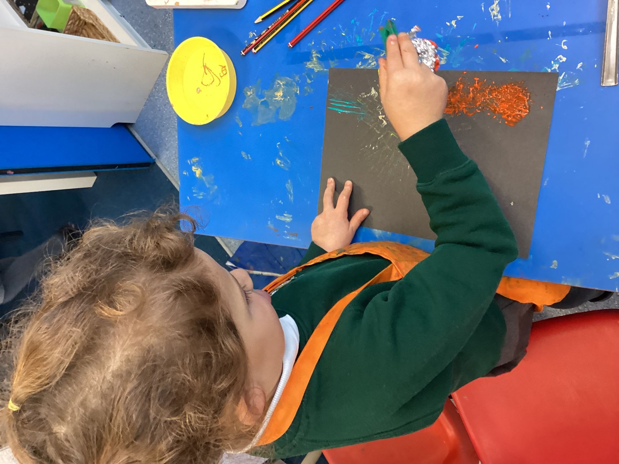 This week we have begun our 'Back in Time' topic. We have discussed what we already know about dinosaurs and we have enjoyed being 'Fossil Hunters' outside. Last week we explored using different tools to create firework pictures and created poppies.